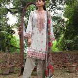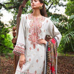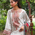 Elegant in ivory: A sophisticated three-piece suit with delicate embroidery and a Munar dupatta, blending classic charm with modern grace