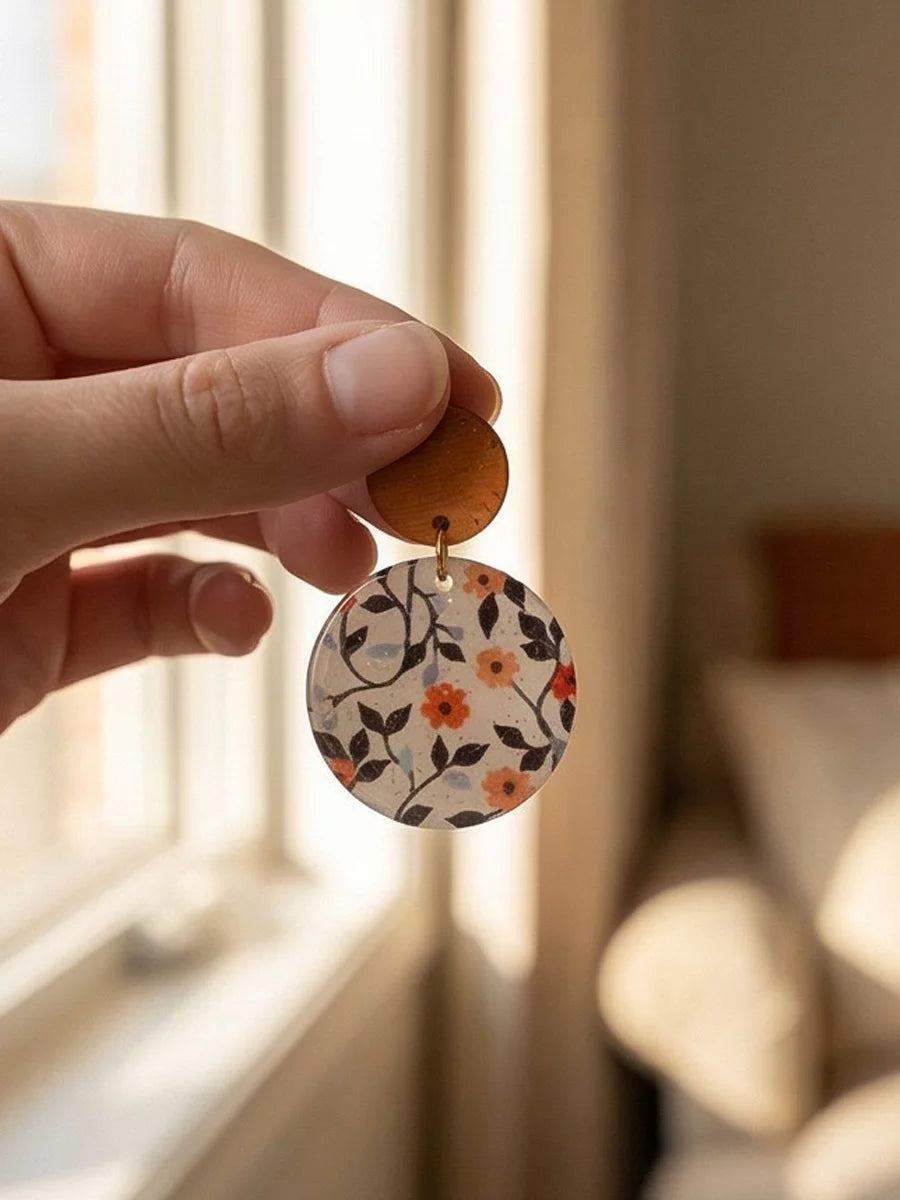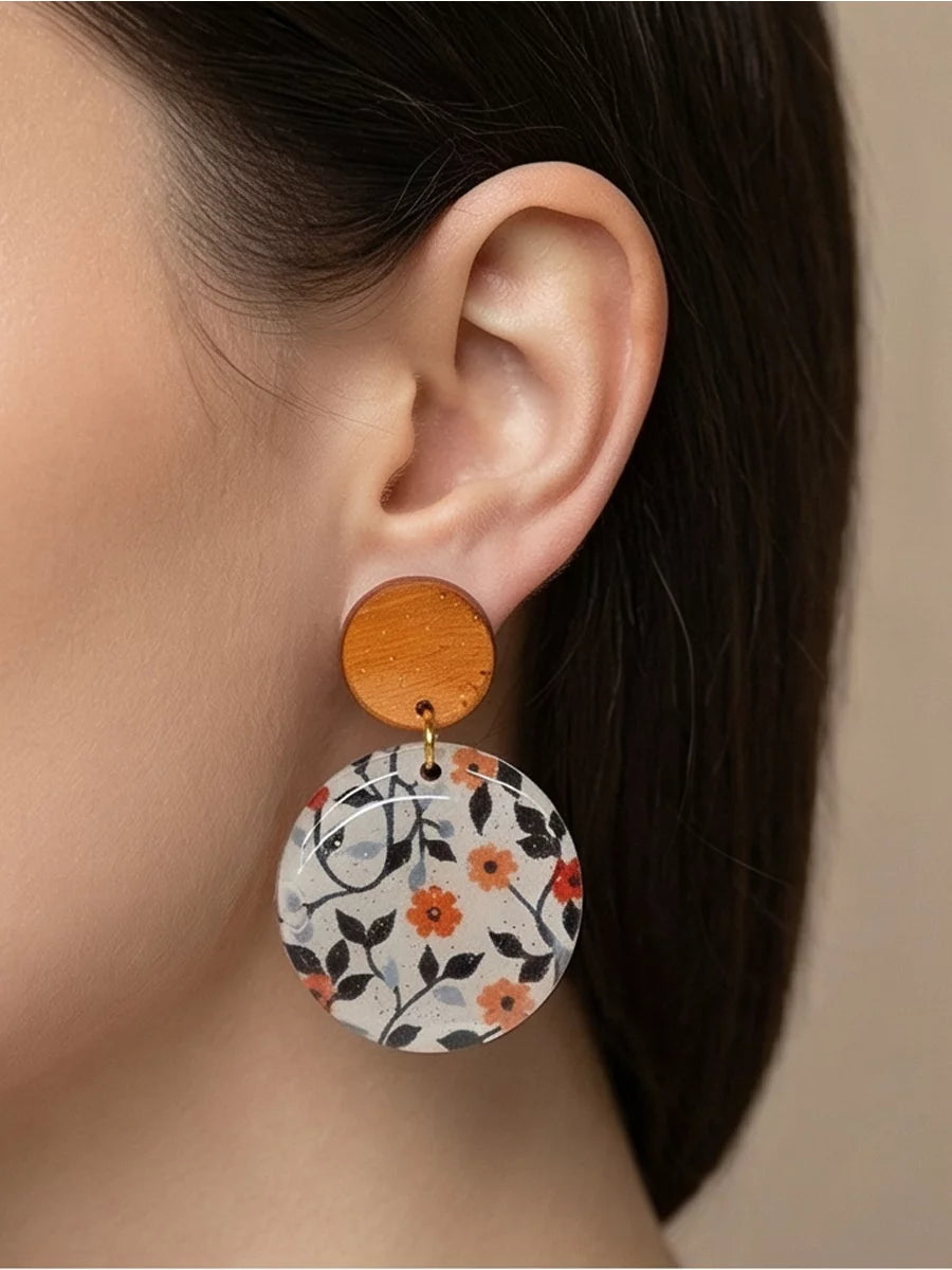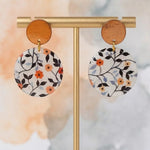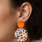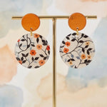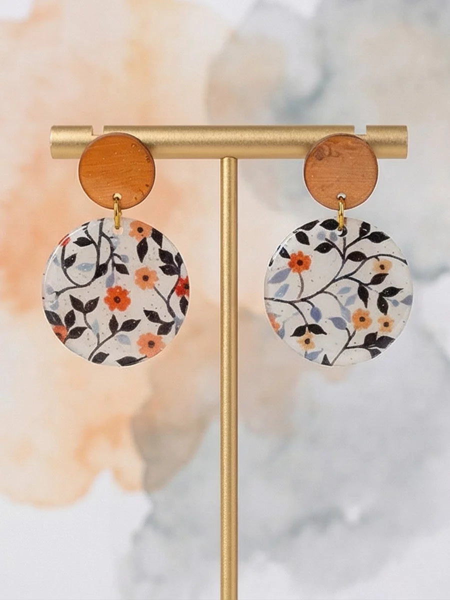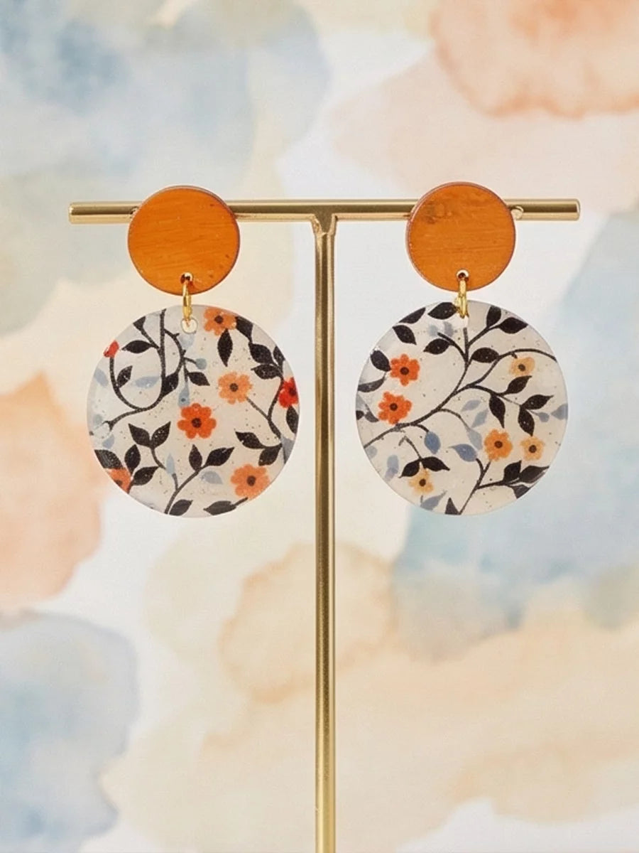 Petal Noir handmade resin earrings feature a small, vibrant orange flower with delicate green and blue leaves. The elegant design brings a pop of color and natural beauty to any outfit.