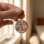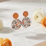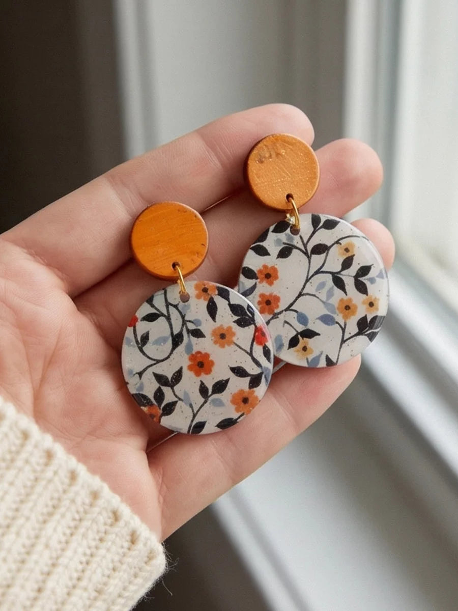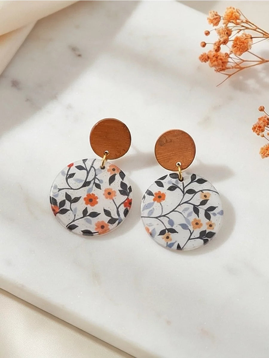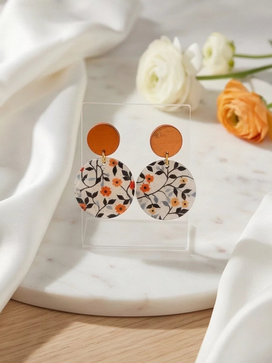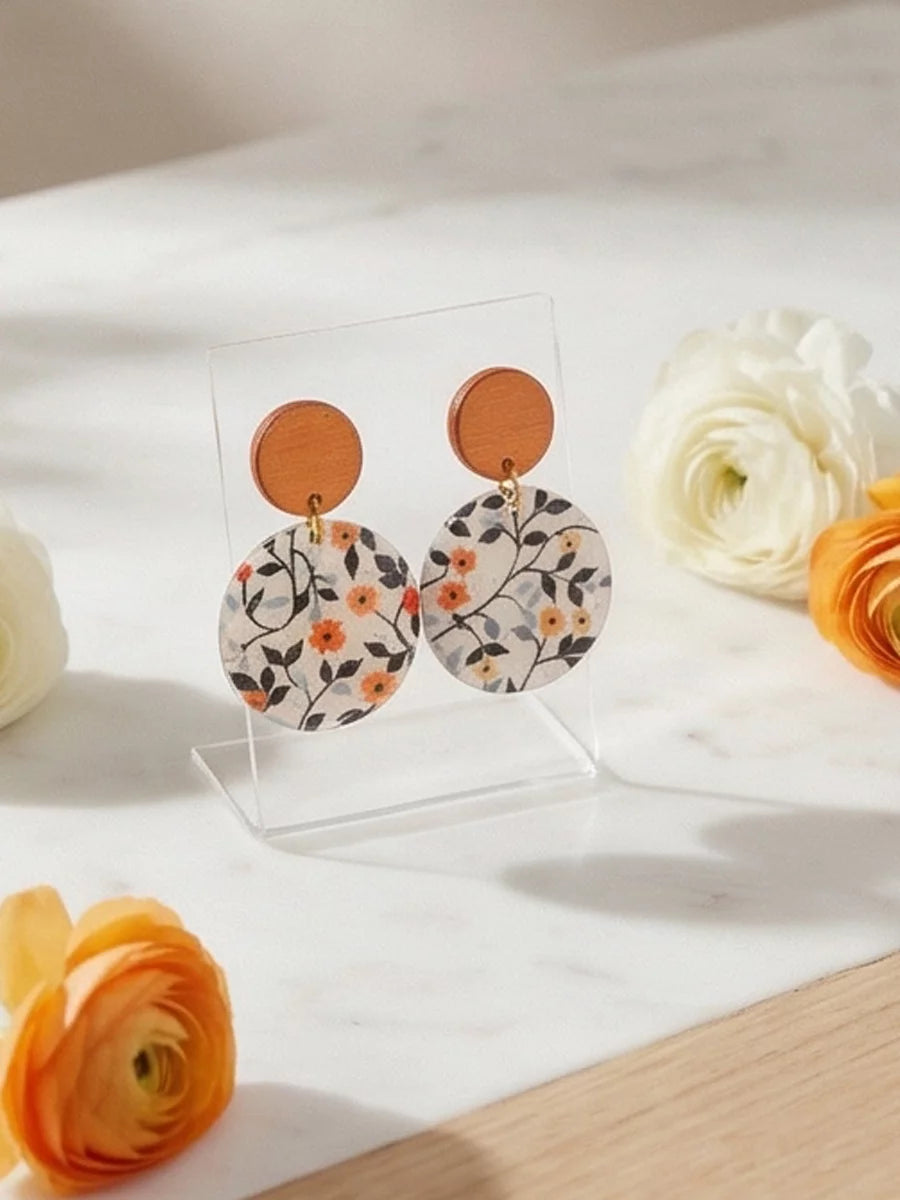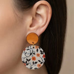 Petal Noir handmade resin earrings feature a small, vibrant orange flower with delicate green and blue leaves. The elegant design brings a pop of color and natural beauty to any outfit.