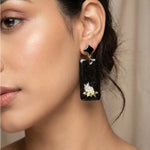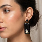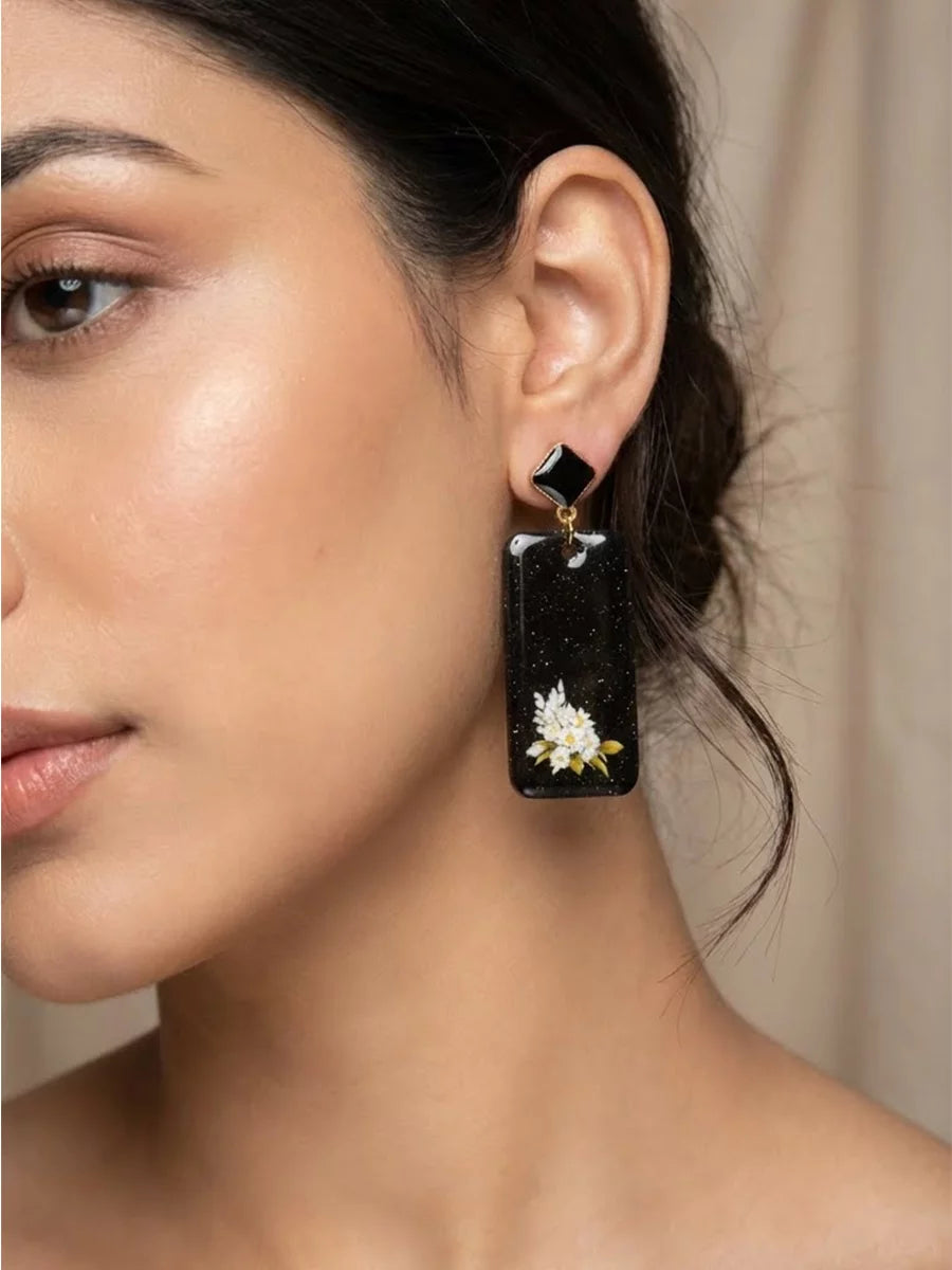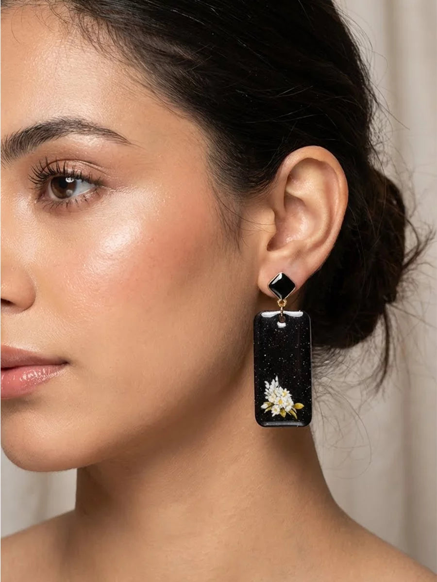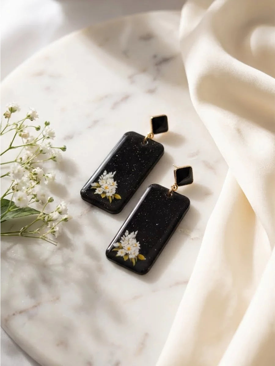 Sunburst handmade resin earrings feature a delicate white flower design set against a bright yellow background. The vibrant contrast creates a fresh, lively look perfect for any occasion.